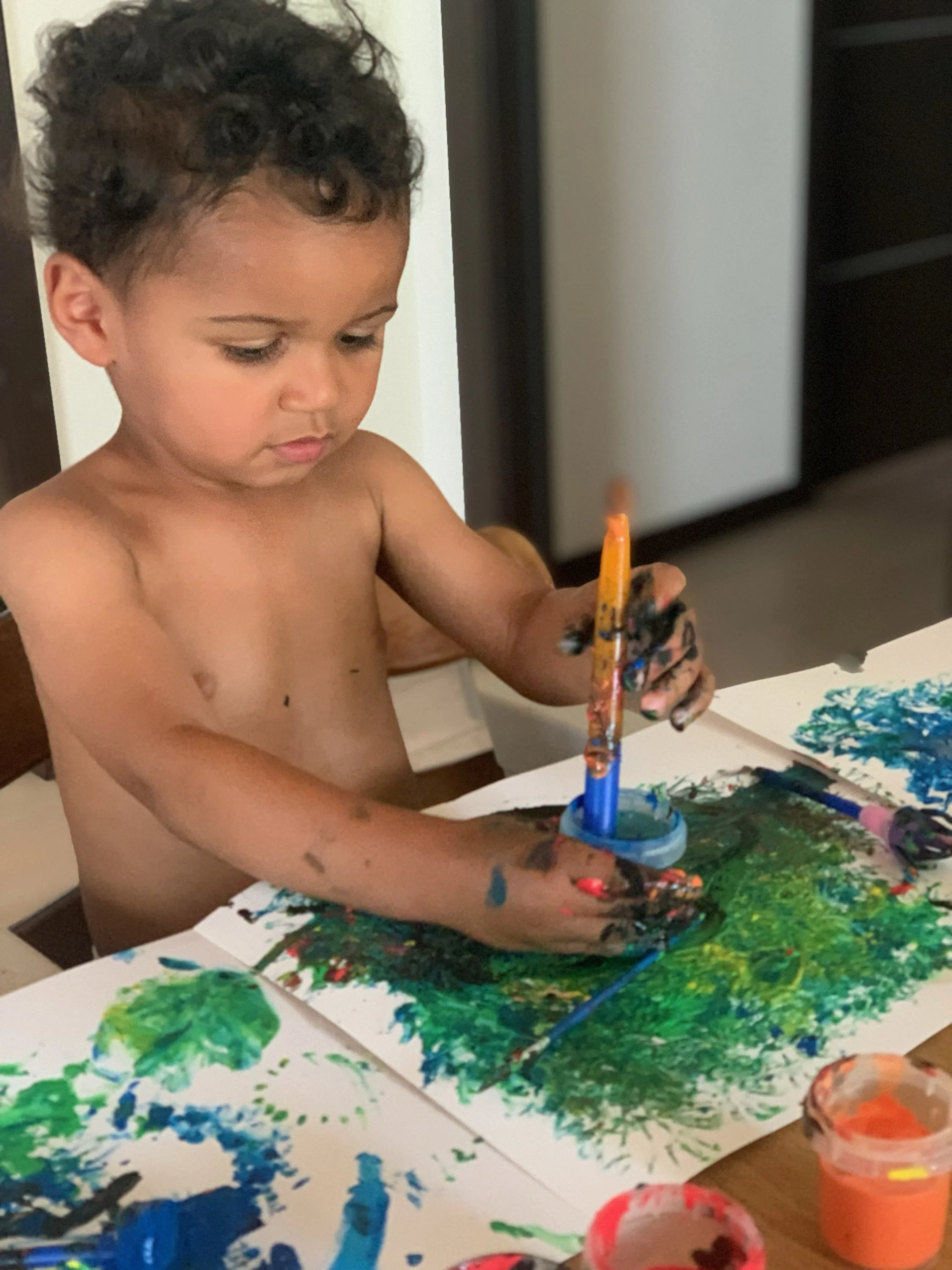 Noah loves to use dabbing and splatting techniques for his painting. He usually paints free of brushes and more with the use of his hands. The style of painting is abstract and bold, with use of lots of colour.