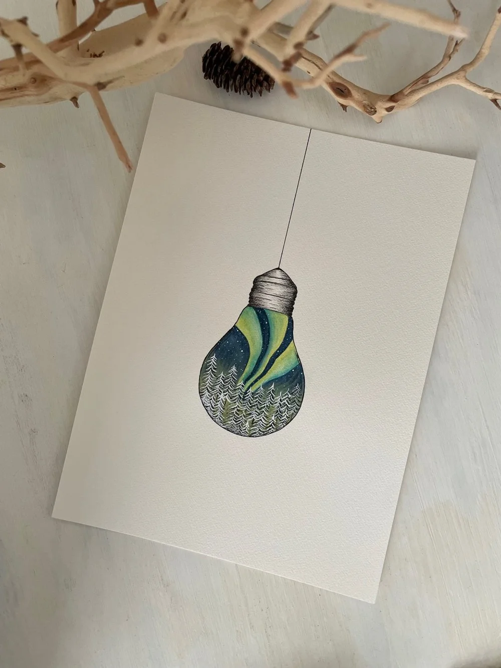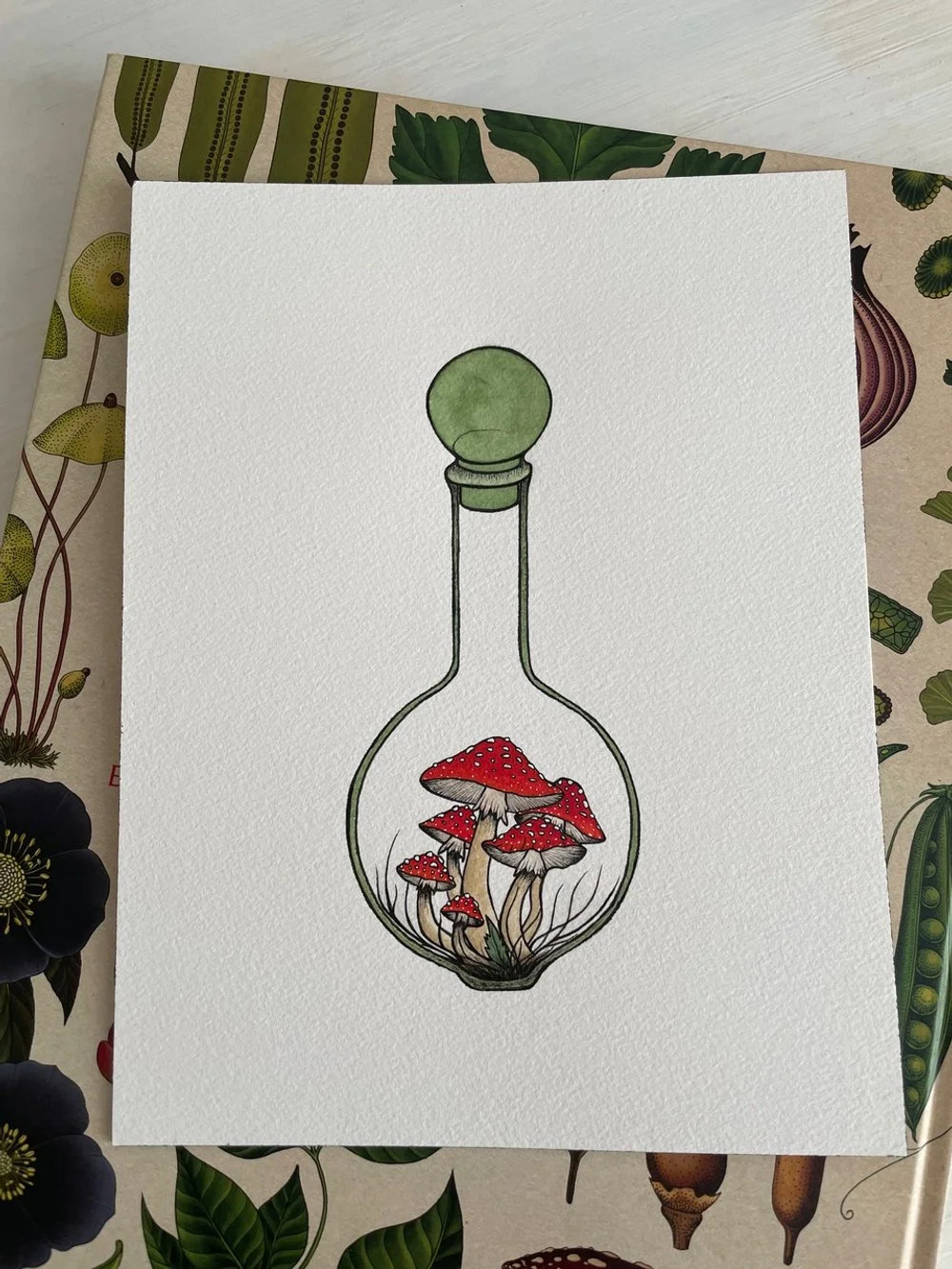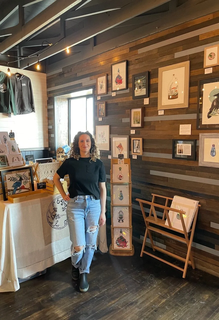 Living in Fairbanks, Alaska was such a great experience and I learned a lot about myself and the direction I wanted to take with my art. I was so grateful to be a part of the Tanana Valley Farmers Market, many local events and having my work displayed at a local brewery. One of my favorite accomplishments was creating a new art collection. This body of work expressed my personal struggles with anxiety, living in Alaska during the pandemic and brought awareness to the effects of winter on people in the Far North. Depression is prevalent in Alaska during the winter months when there are long stretches of darkness and very few hours of daylight. The collection was titled, “Don’t Bottle It Up.” My hope was that by illustrating these concepts it would give others a free space to talk about their own hardships with mental health so that they weren’t keeping it hidden like poison. I did not realize how much of an impact this would make on the community. It opened so many doors of conversations that were not only healing for others, but also for myself. It became a daily reminder to be a light for others even in the darkness.